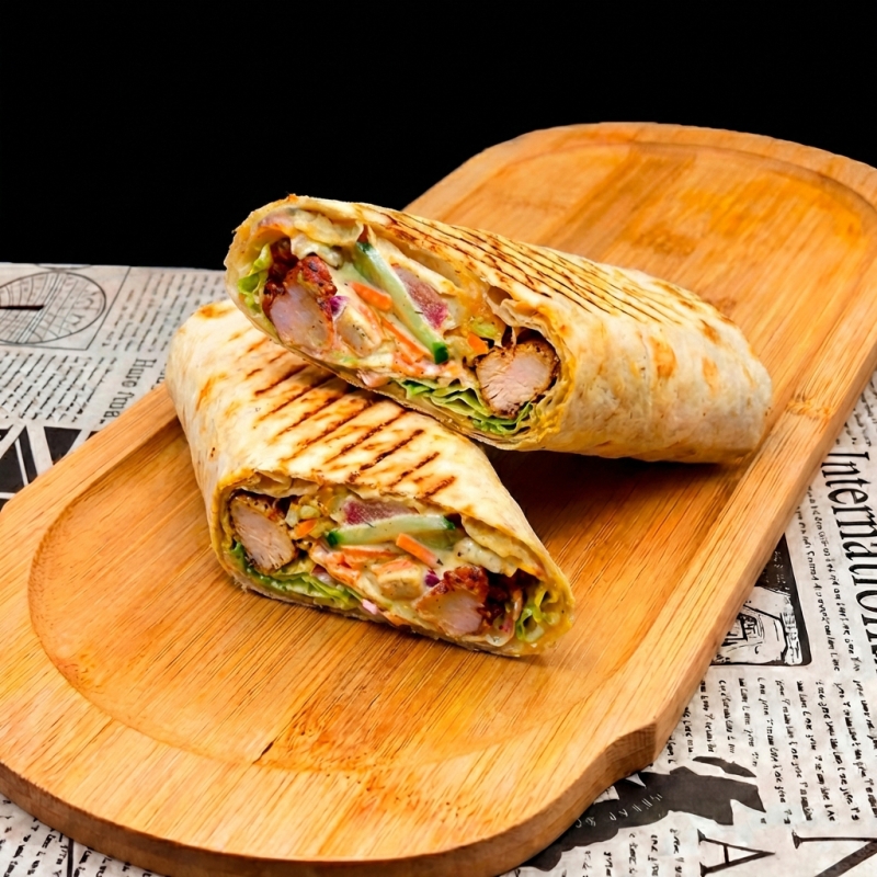 Ароматная свинина, обжаренная до золотистой корочки, свежие овощи и насыщенный фирменный соус – в мягком лаваше