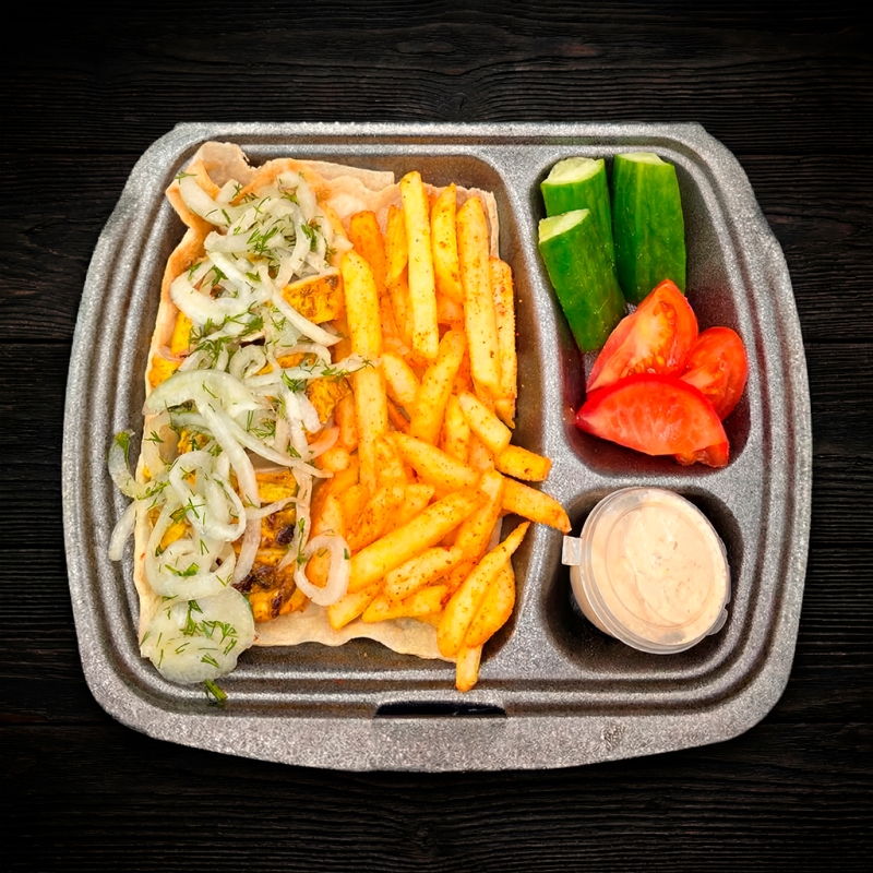 лепешка, шашлык из куриного филе, помидор, лук ялтинский, картофель фри, соус фирменный