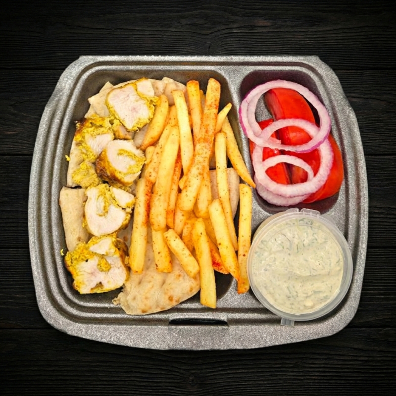 лепешка, шашлык из куриного филе, помидор, лук ялтинский, картофель фри, соус фирменный
