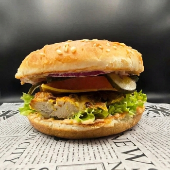 булочка, шашлык из куриного филе, сыр чеддер, помидор, лук ялтинский, огурцы маринованные, соус фирменный