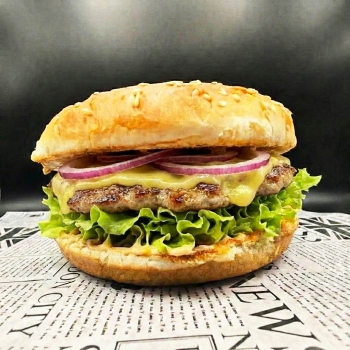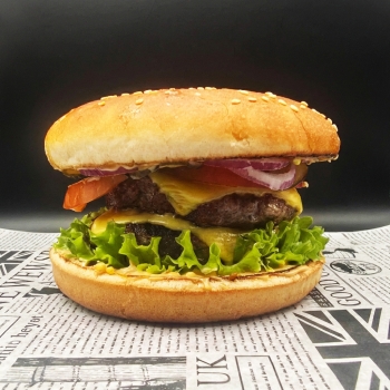 булочка, котлета свино-говяжья, сыр чеддер, помидор, лук ялтинский, огурцы маринованные, соус фирменный