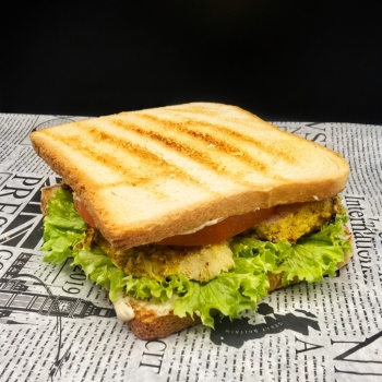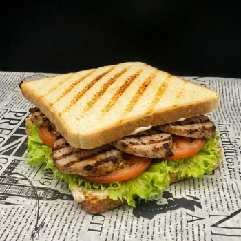 хлеб тостовый, шашлык из куриного филе, сыр чеддер, помидор, салат, соус фирменный